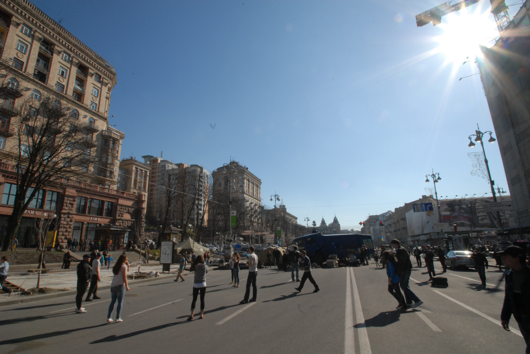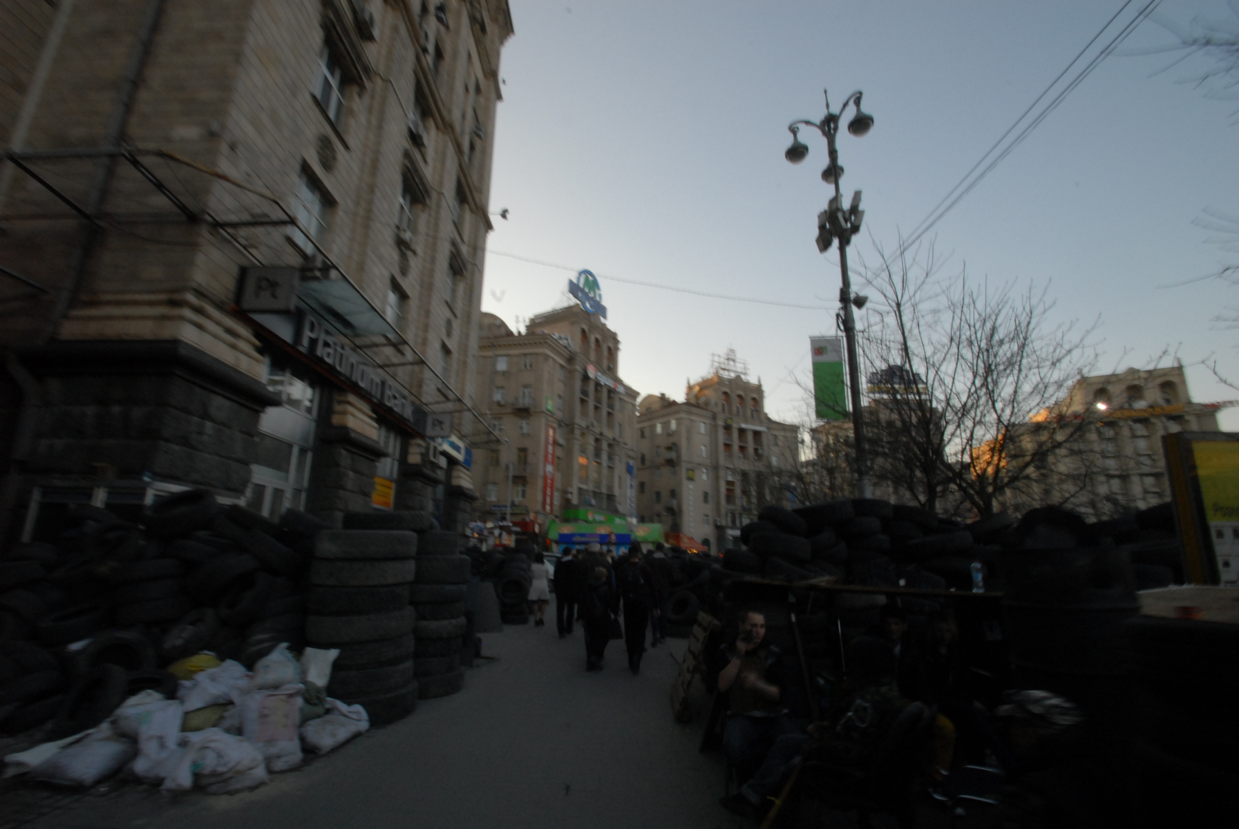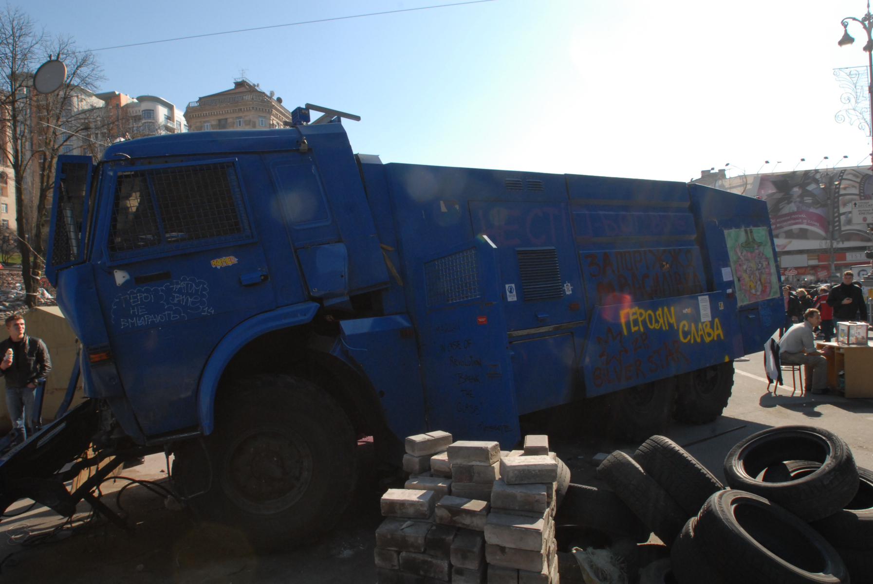 Nothing abnormal looking about the town so was thinking that would be that, then turned the corner into what looked like ‘Main Street’ and came across The Barricades. The whole length was occupied with large tentage; loads of soldiers hanging about; shed loads of tyres piled up as some kind of defence; yoofs hanging around playing ball games in the street, thousands (no exaggeration) of Ukraine flags giving it the Blue and Yellow; bricks and mortar strewn around the place; people chopping wood to throw on the makeshift fires; merchandise trestle tables selling more flags, ribbons, caps, badges; and then what I think is a water cannon truck which must have been involved in the goings on weeks back, left there smashed in from the front at a jaunty angle like it’s going nowhere soon. But surrounding all of this, daily life and shopkeeping continues as normal. I snapped away happy that I’d come across a bit of what I was looking for and went away to find an overdose of caffeine. Two nights in a row on about 4-5 hours isn’t ideal.