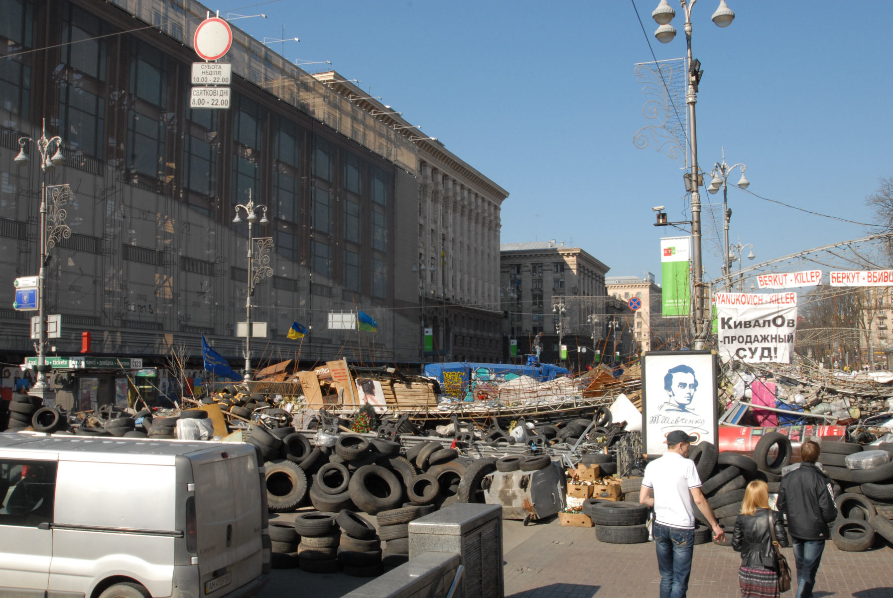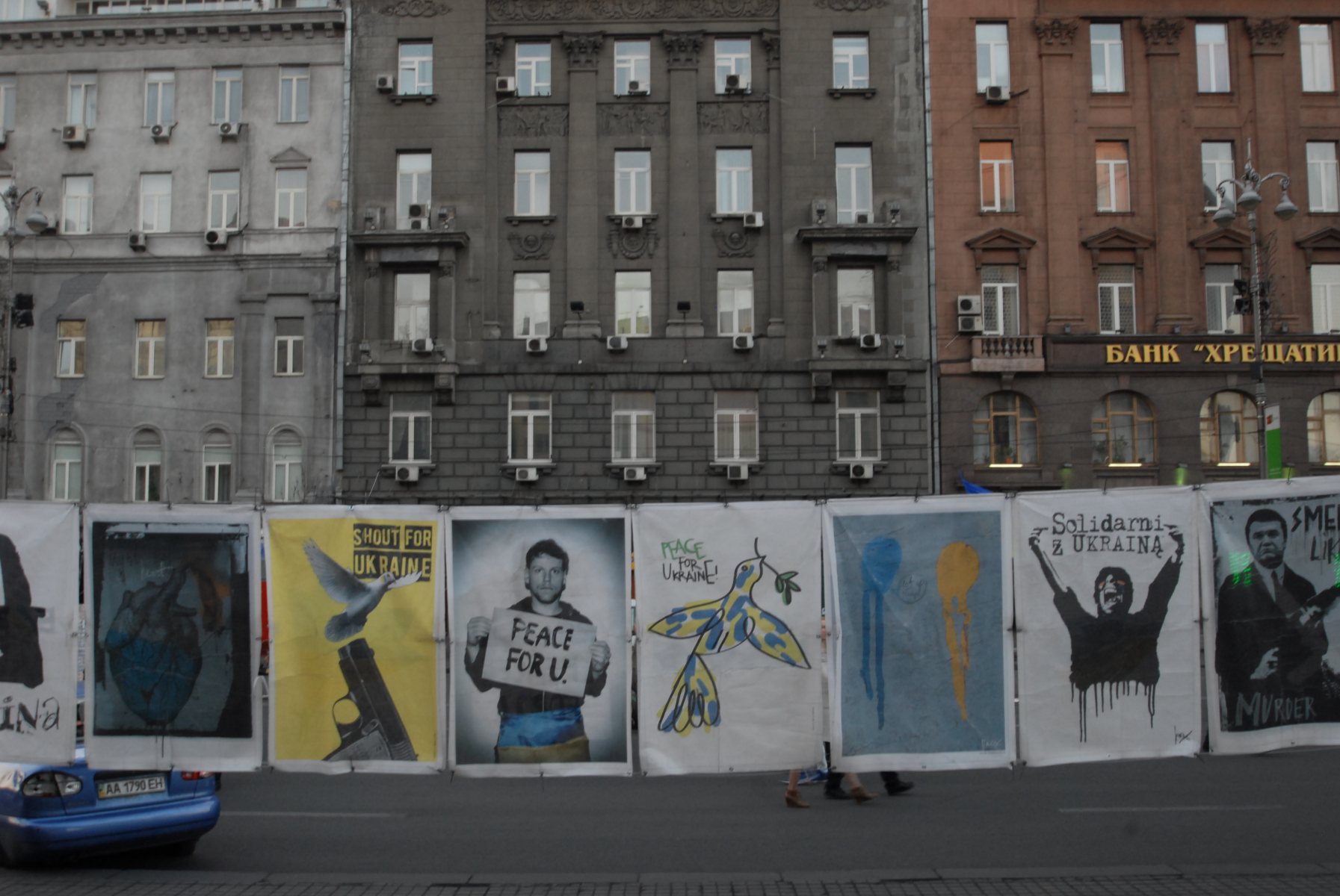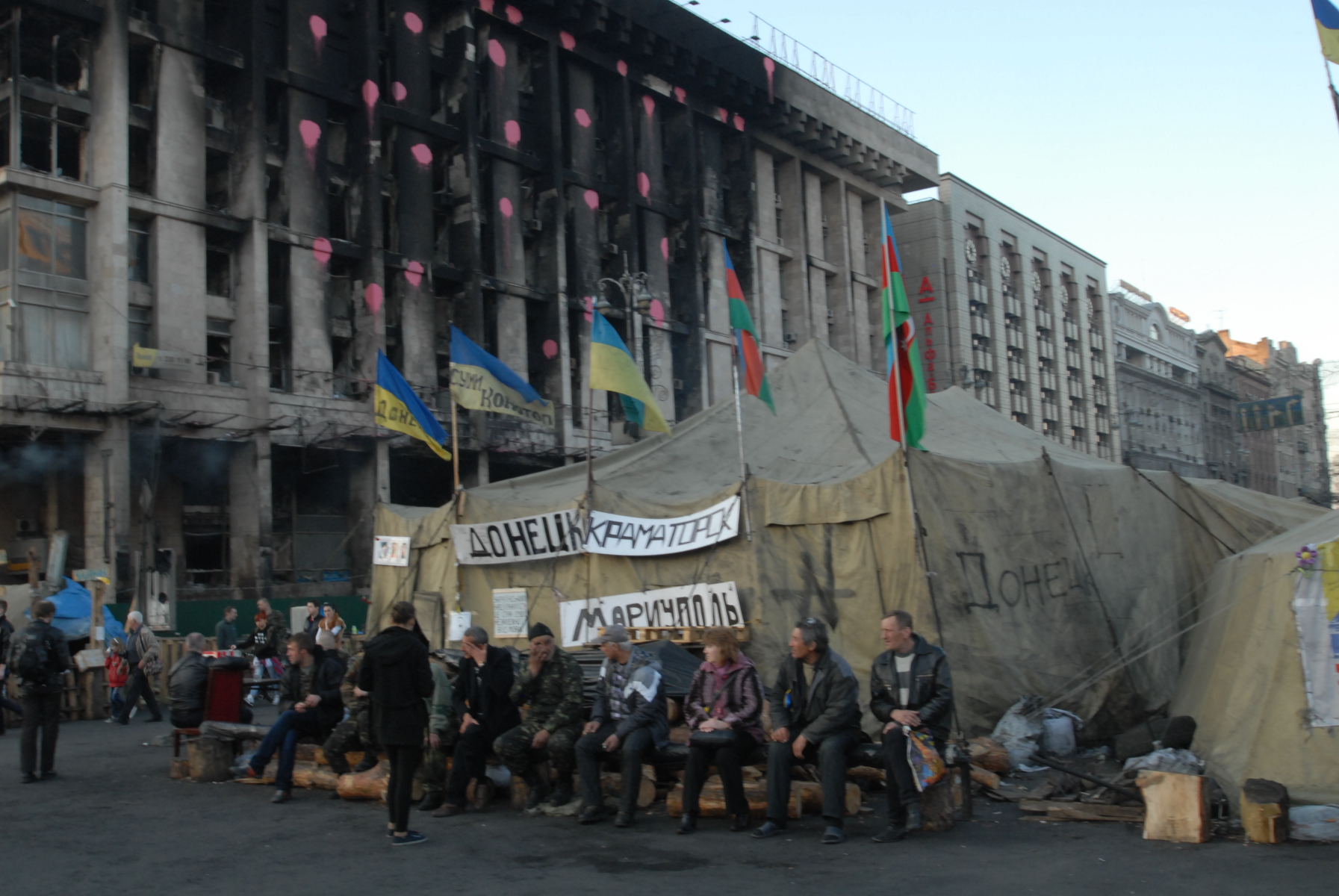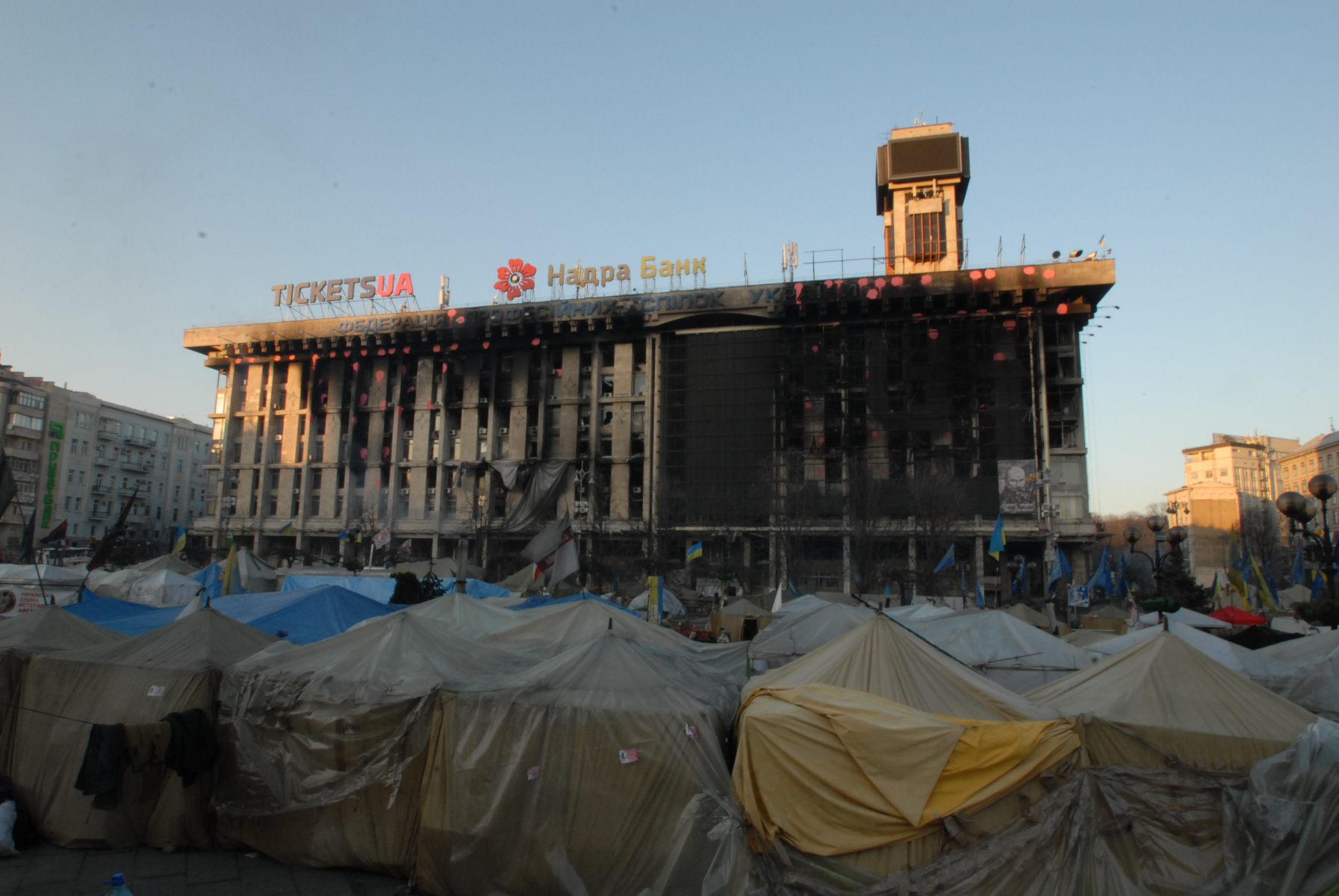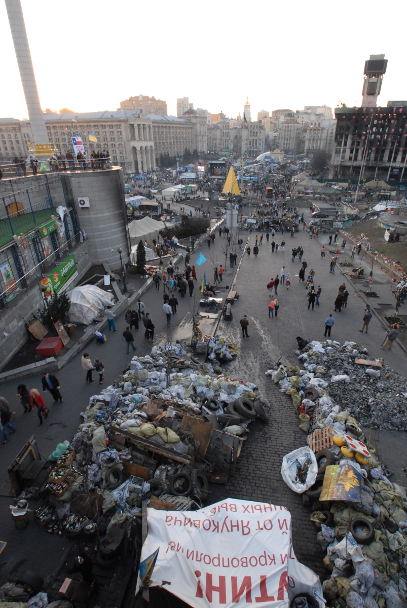 18h30, Right, this stuff I didn’t see enough of on the news (BBC pictures from 19.02.2014). And I just didn’t expect that the aftermath would still be all around. I came back to where the action had been and explored further down into and around Independence Square, the part I originally found was only the start. Parts of the city are a war zone. The vibe is like the calm after the storm before the storm. I’ve left my main bag at the hostel but have no concern for any of the camera kit I’m carrying (famous last words) as with such shit having gone down, there seems to be a collective feeling of peace and good will hanging around the air. The soldiers are mostly sans weapons, they just chill, waiting. There’s a lot of people on their soap boxes telling others how it is and everybody seems to be in agreement: it’s not good. There’s a large pro-EU bit. There’s Christian leaders who seem to be rallying to keep others happy. There are thousands of flowers all around, where people have fallen. Sometimes there’s an outline of stones where a body would have been. There’s a large building headed ‘TicketsUA’ that’s been blown to fuck. There’s a tent city within the city as people stand by, unprepared for the next move. It seems as if people haven’t cleared up perhaps because they see it’s not over so why do a job twice. This city isn’t how it wants to be. Why can’t people just get along. I have another coffee and walk away from it all to go retrieve my main bag just as it becomes dark.