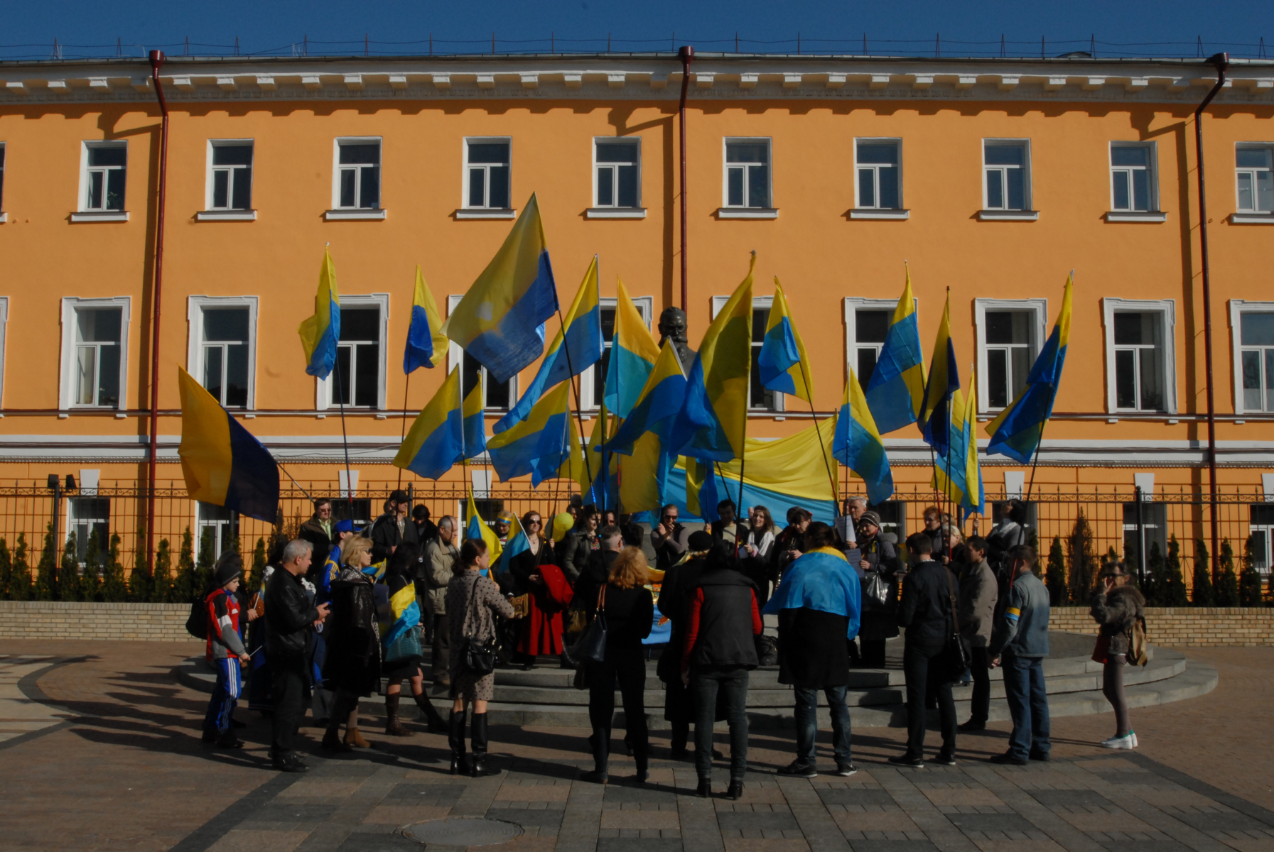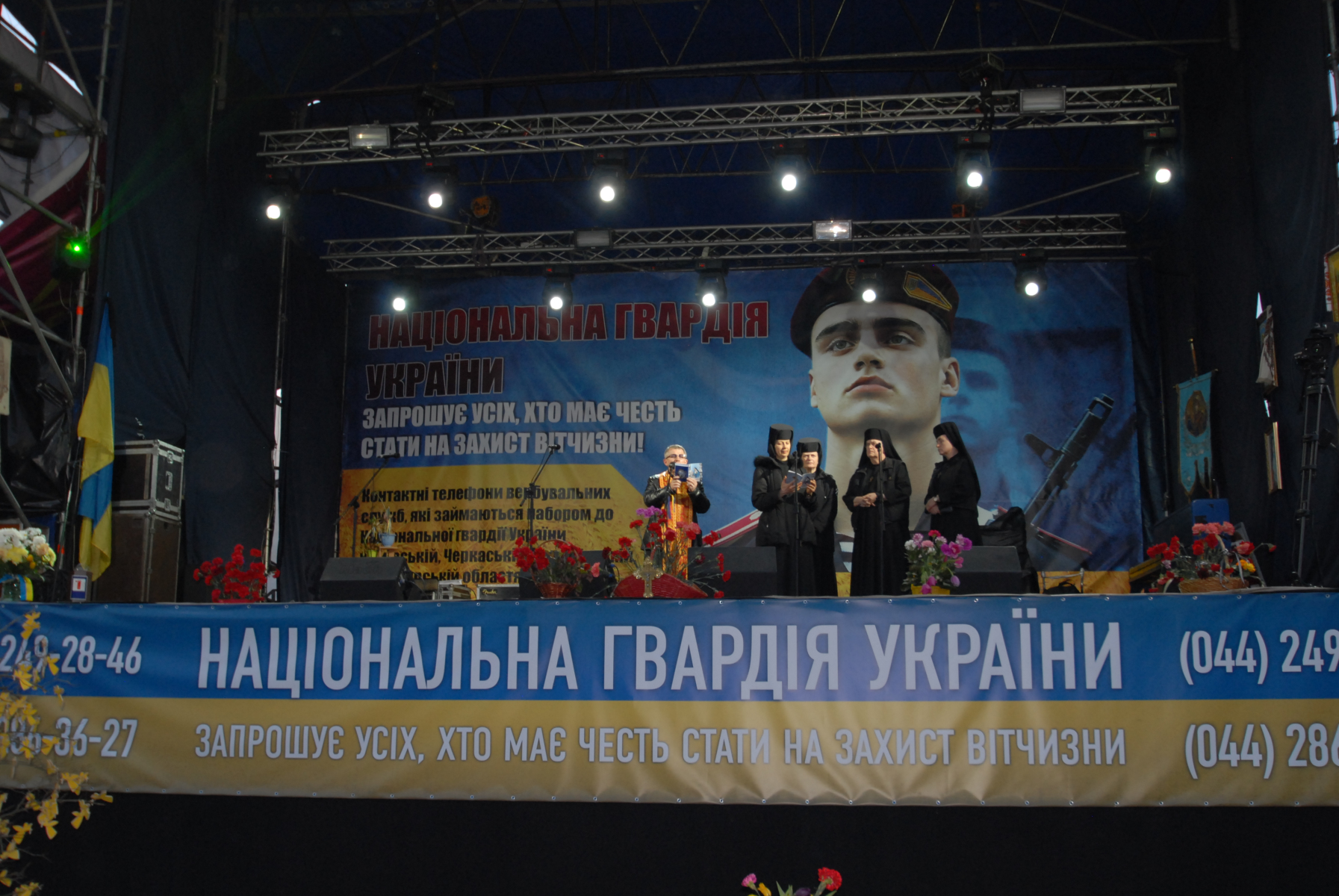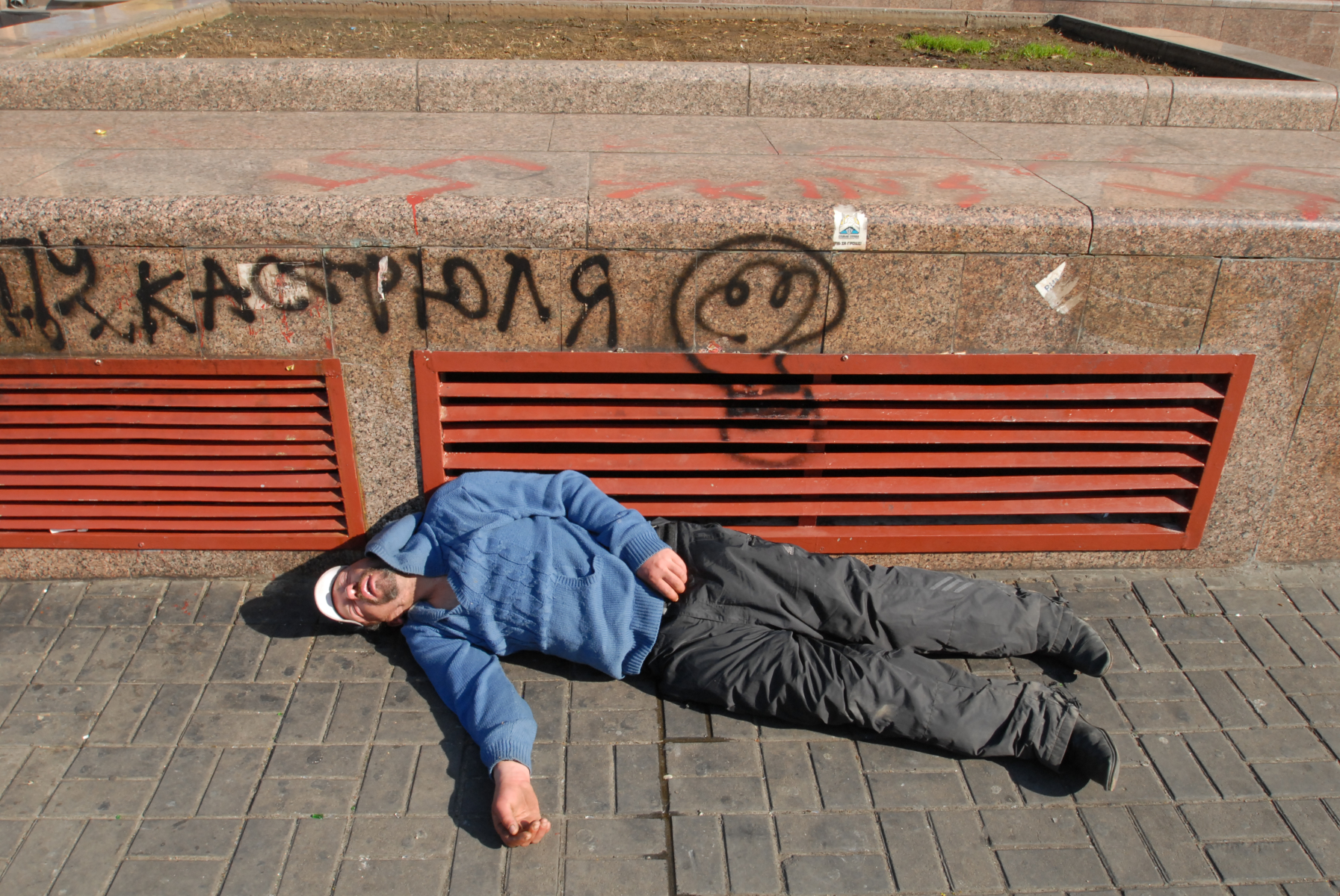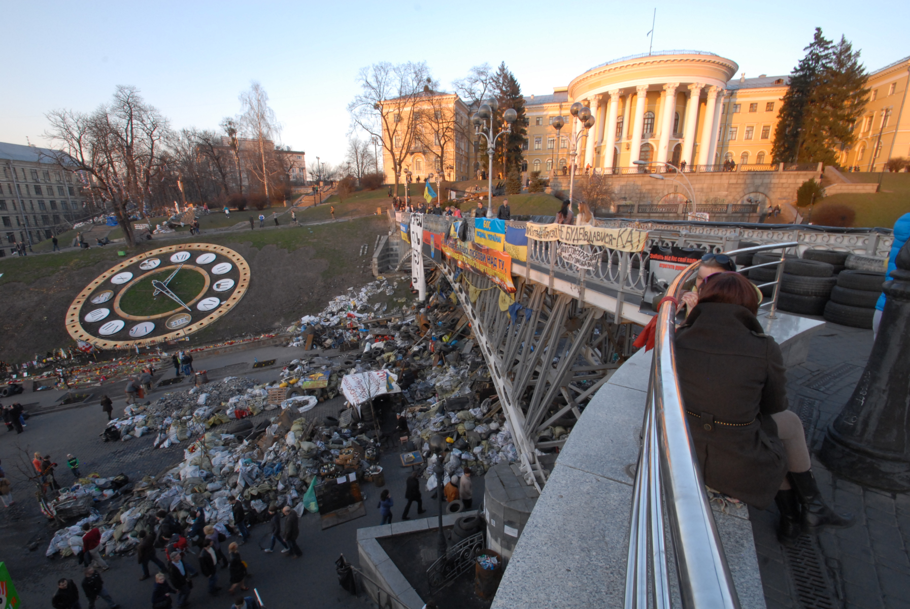 18h30, Right, this stuff I didn’t see enough of on the news (BBC pictures from 19.02.2014). And I just didn’t expect that the aftermath would still be all around. I came back to where the action had been and explored further down into and around Independence Square, the part I originally found was only the start. Parts of the city are a war zone. The vibe is like the calm after the storm before the storm. I’ve left my main bag at the hostel but have no concern for any of the camera kit I’m carrying (famous last words) as with such shit having gone down, there seems to be a collective feeling of peace and good will hanging around the air. The soldiers are mostly sans weapons, they just chill, waiting. There’s a lot of people on their soap boxes telling others how it is and everybody seems to be in agreement: it’s not good. There’s a large pro-EU bit. There’s Christian leaders who seem to be rallying to keep others happy. There are thousands of flowers all around, where people have fallen. Sometimes there’s an outline of stones where a body would have been. There’s a large building headed ‘TicketsUA’ that’s been blown to fuck. There’s a tent city within the city as people stand by, unprepared for the next move. It seems as if people haven’t cleared up perhaps because they see it’s not over so why do a job twice. This city isn’t how it wants to be. Why can’t people just get along. I have another coffee and walk away from it all to go retrieve my main bag just as it becomes dark.
